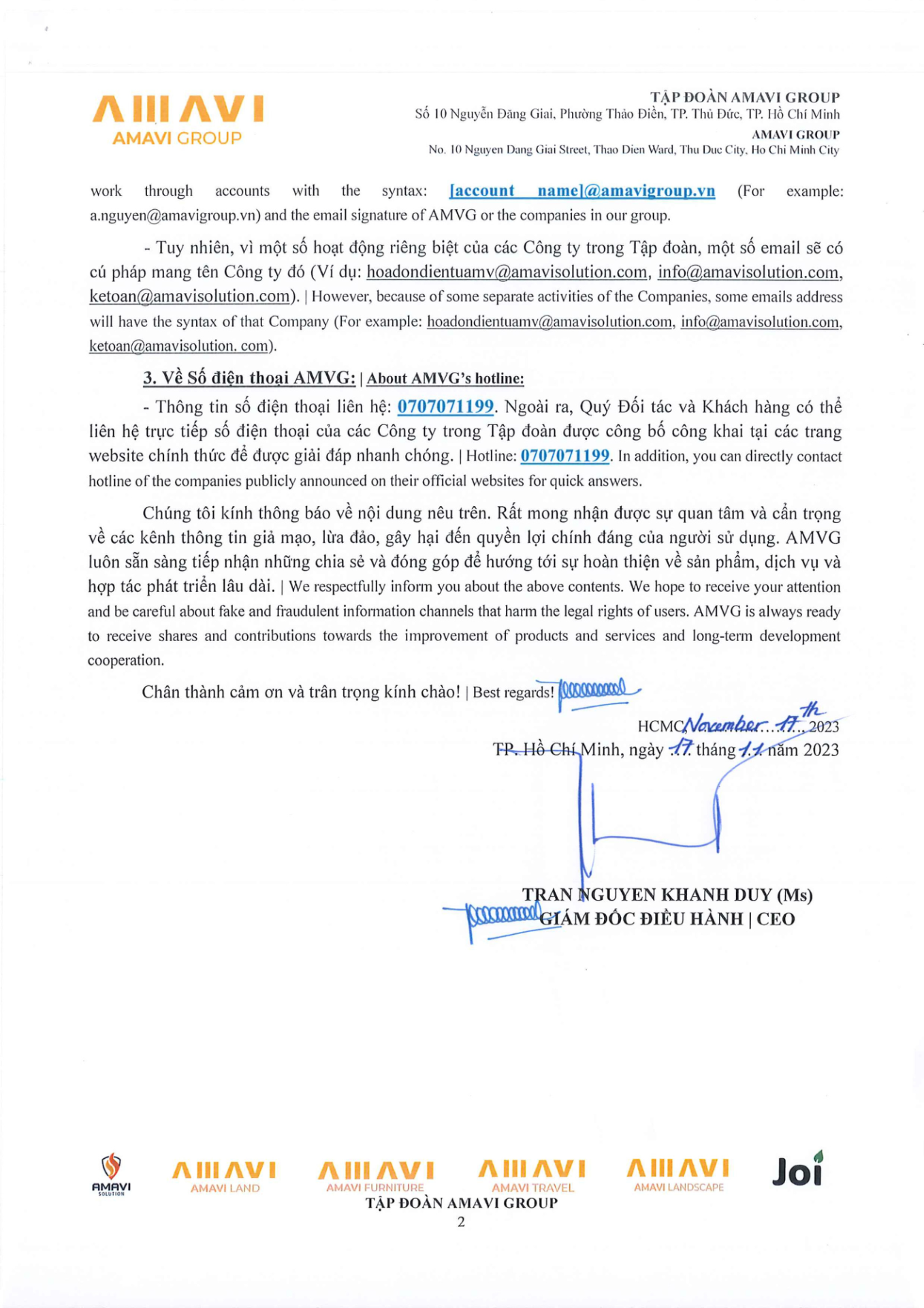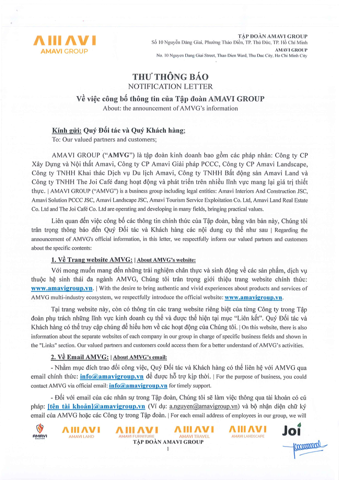 At Amavi Group, we consistently dedicate ourselves to each distinct business sector with a mission to create sustainable value for customers, businesses, and society. In terms of official announcements by the Group, we are pleased to inform our esteemed partners and customers about specific details, including: