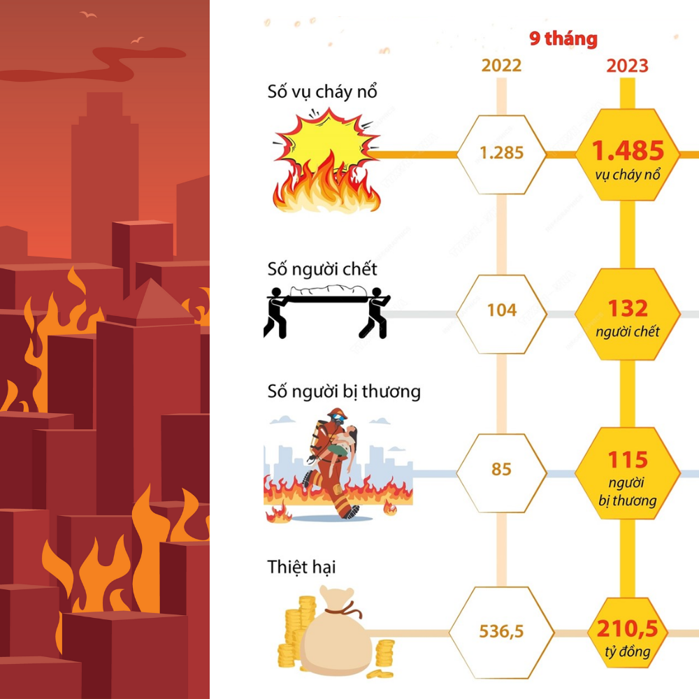 Trong 9 tháng năm 2023, cả nước xảy ra 1.485 vụ cháy, nổ, làm 132 người chết và 115 người bị thương, thiệt hại ước tính 210,5 tỷ đồng, tuy giảm 60,8% so với cùng kỳ năm 2022 nhưng vẫn gây ra các thiệt hại nghiêm trọng về người và tài sản.